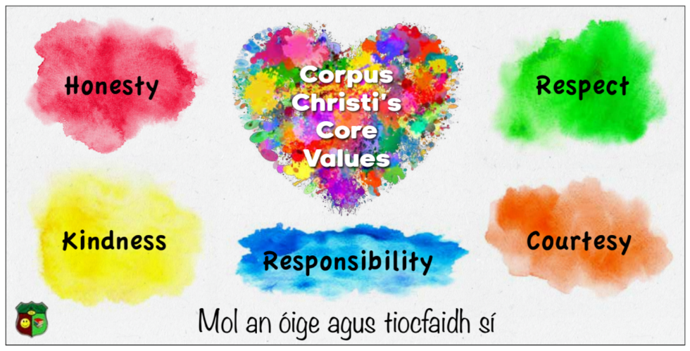 Corpus Christi is a school with a Catholic ethos and has the Catholic Archbishop of Dublin as its patron. It is a community of children, parents, families, teachers, and those from the parish who work together in the spirit of the Gospel. Our values are those of the Gospel, respect, community, justice, faith, commitment, forgiveness, excellence, compassion and dignity. We try to model and promote these values in all interactions between pupils, between pupils and staff, between parents and staff and among staff and management itself.